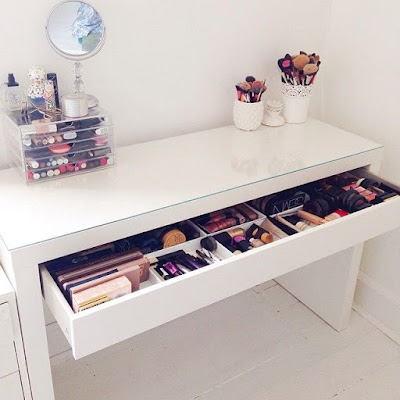 Essa com certeza é algo que todo mundo pode reproduzir, é super válido usar uma escrivaninha como mesa para as makes!